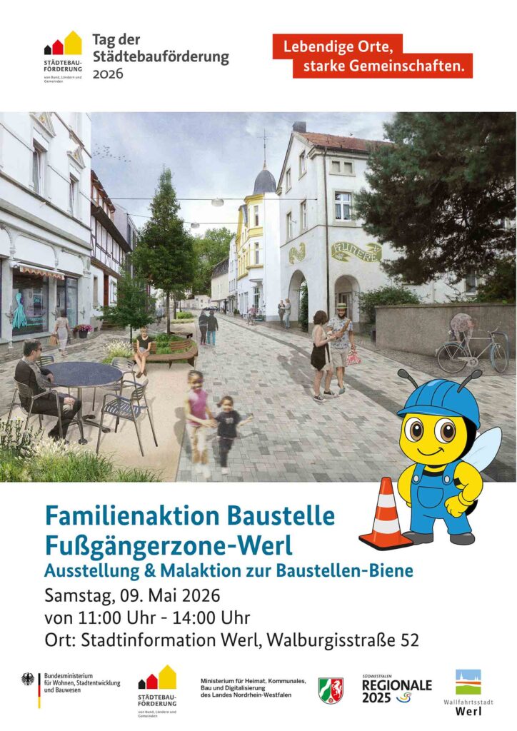 Vor Ort wird anlässlich des Startes zur Umgestaltung der Werler Fußgängerzone die „Familienaktion Baustelle Fußgängerzone Werl“ mit einer Ausstellung und Malaktion zur Baustellen-Biene für Jung und Alt stattfinden.